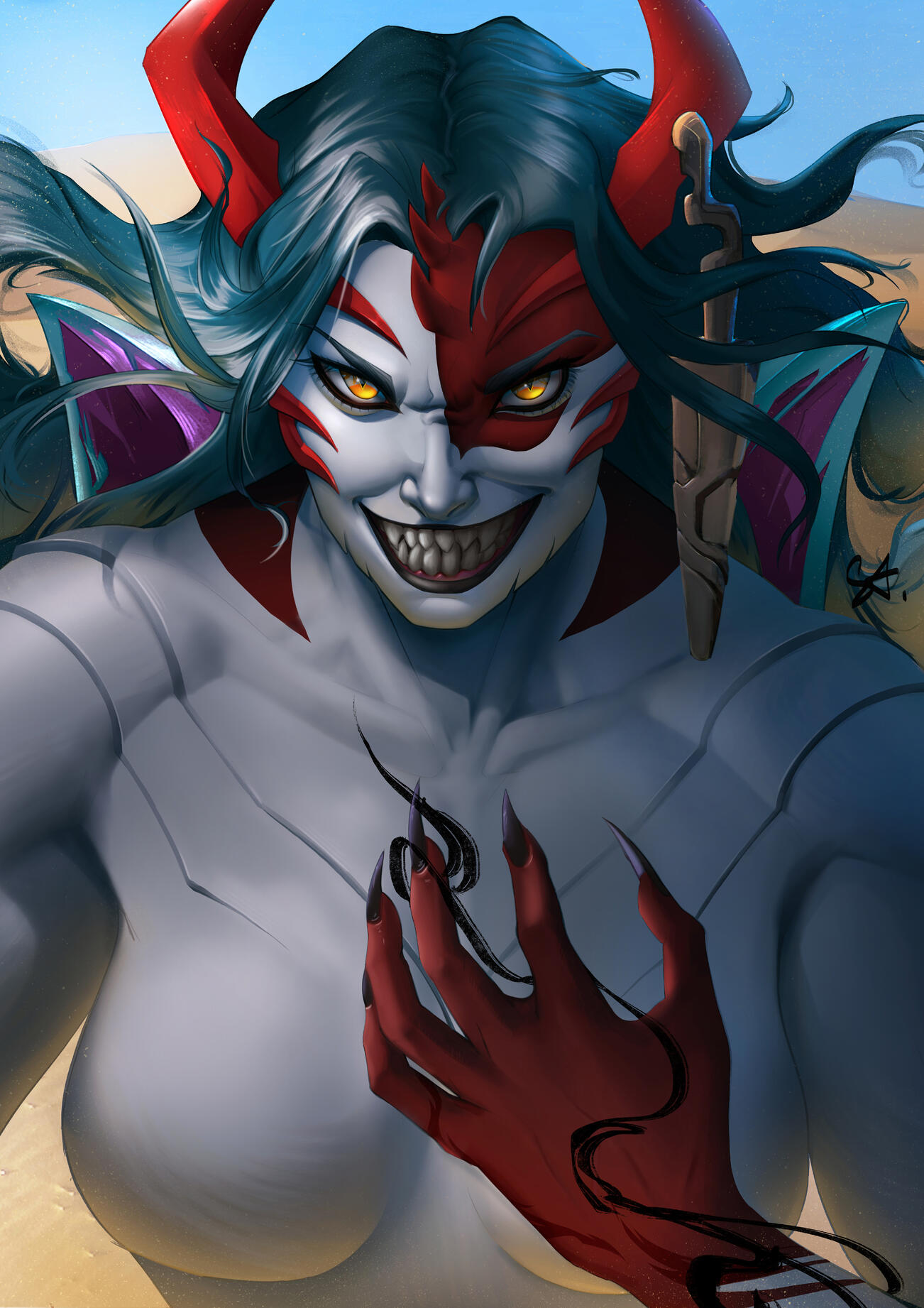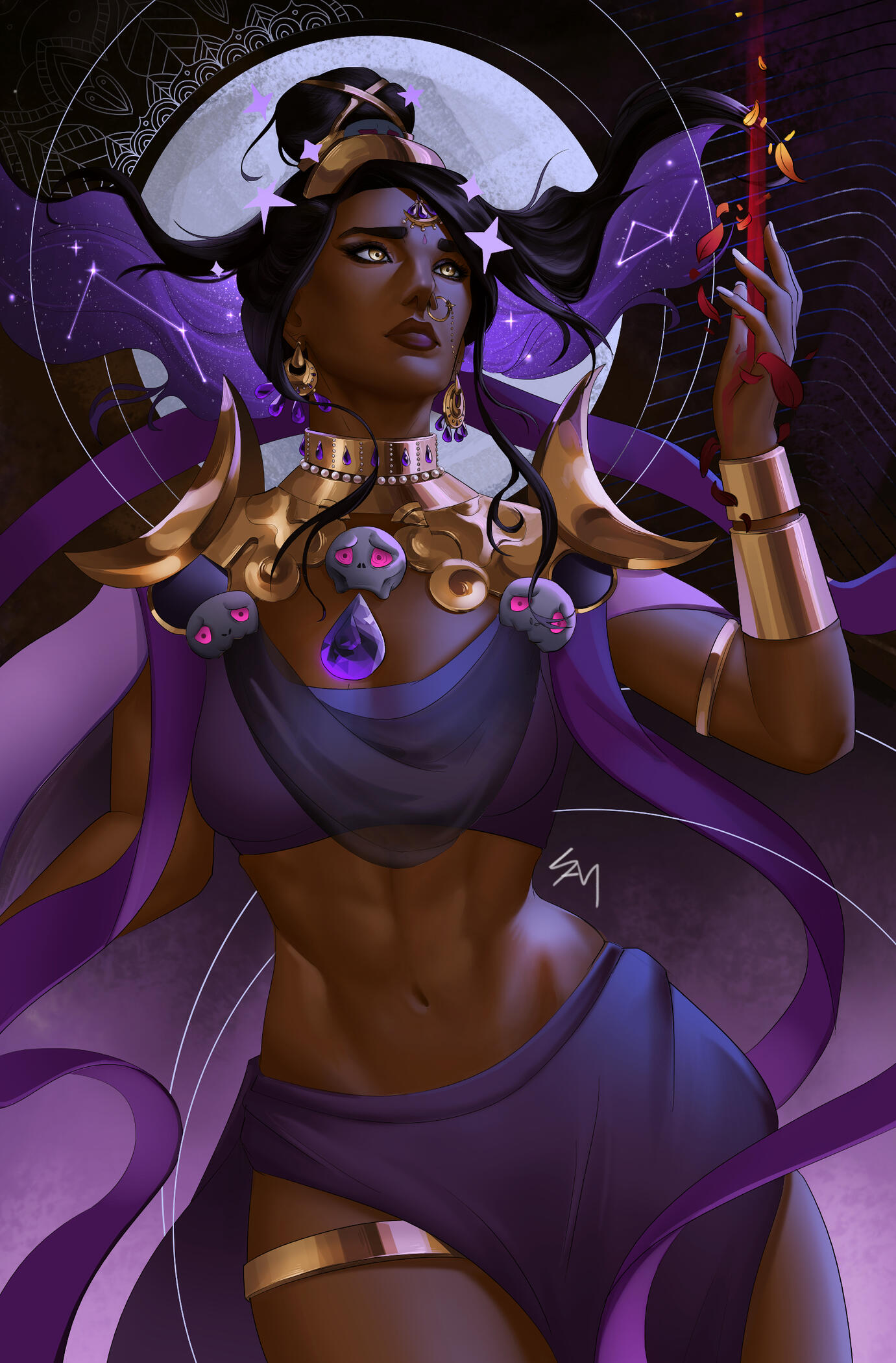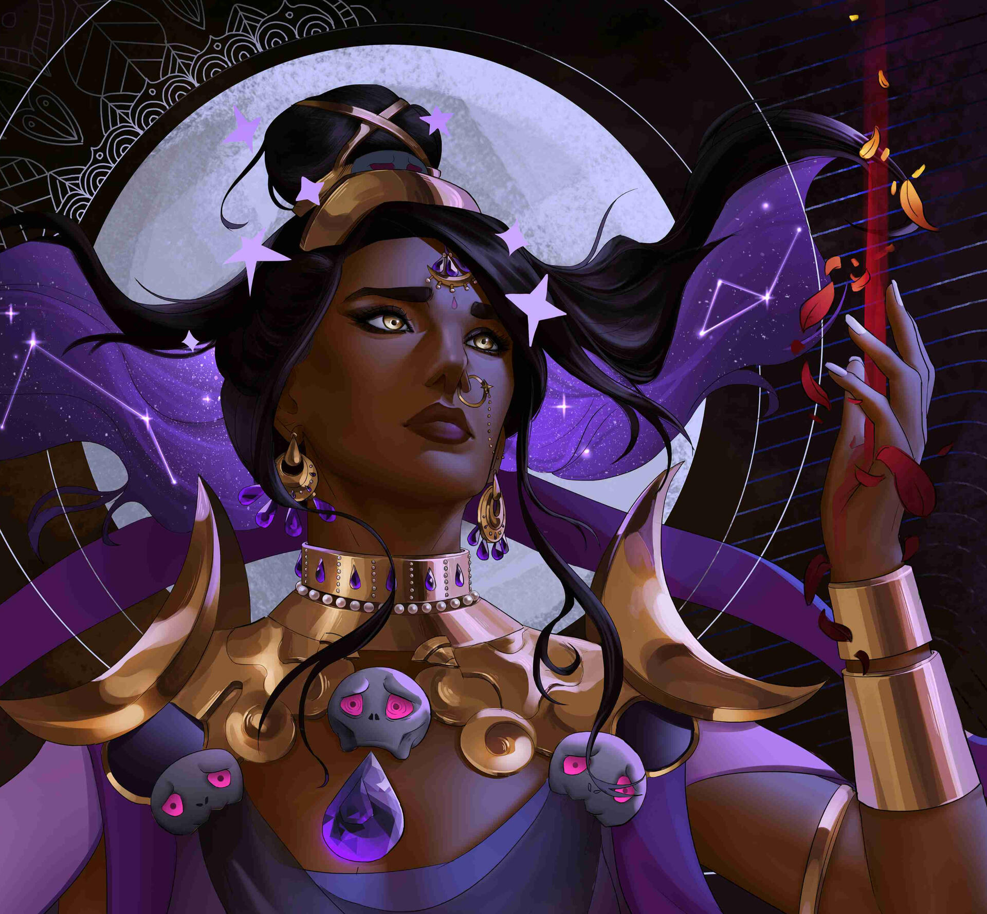 A reimagined Nyx (from Hades), taking influences traditional Indian clothing and jewellry.